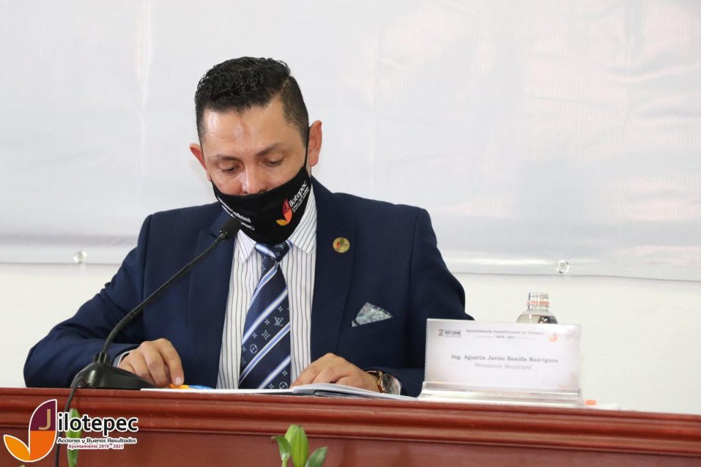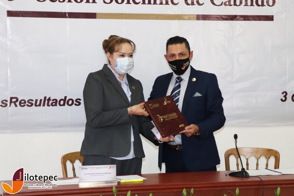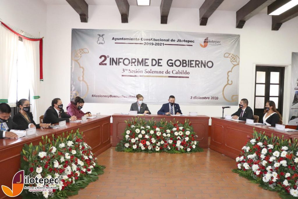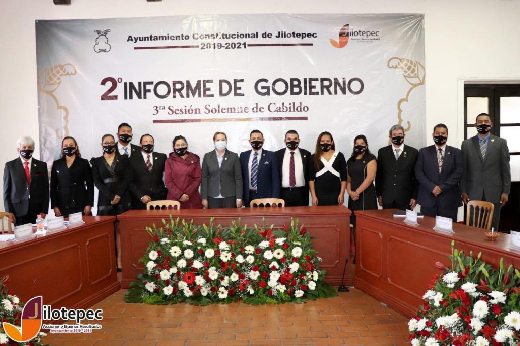 El Presidente Agustín Bonilla, la Síndico Municipal y los Regidores del Ayuntamiento de Jilotepec en compañía de la C.P. Mercedes Colín Guadarrama representante personal del Gobernador Alfredo del Mazo Maza, concluyeron la 3º Sesión Solemne de Cabildo en donde el Ing. Agustín Bonilla Rodríguez informó sobre la situación que guarda la administración pública municipal en su 2º Informe de Resultados.