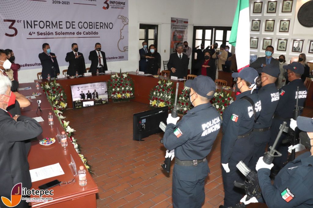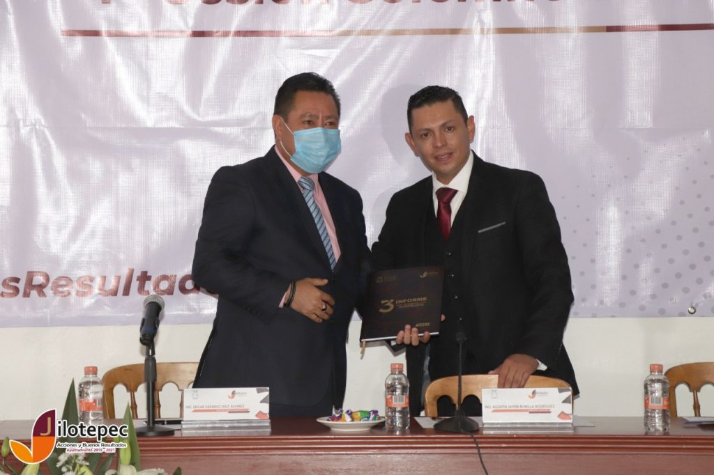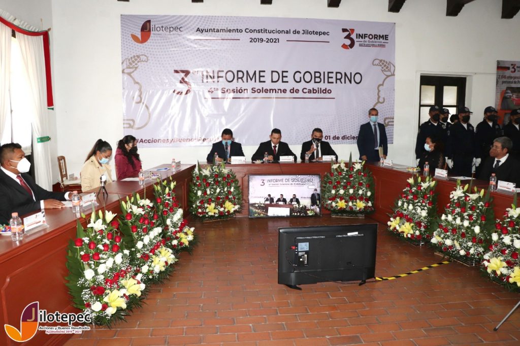 En Sesión Solemne de Cabildo, el Ing. Agustín Bonilla, Presidente Constitucional de Jilotepec, realizó su 3er. Informe de Gobierno, presentando los resultados obtenidos durante este tercer año de gestión, ante la presencia del Ing. Edgar Gerardo Díaz, Director General de Agricultura de la Secretaría del Campo, en representación del Lic. Alfredo del Mazo Maza, Gobernador del Estado de México, así como del cuerpo edilicio.